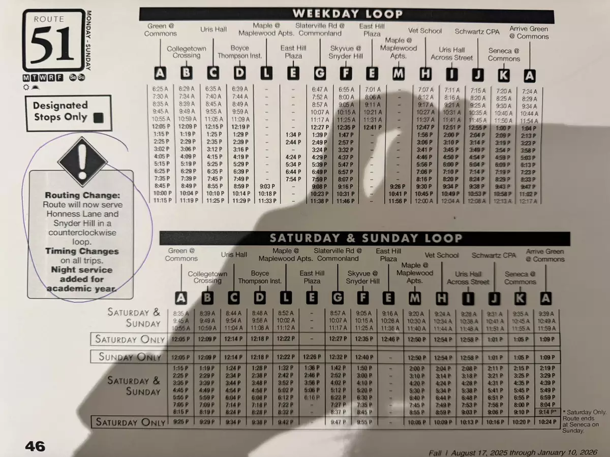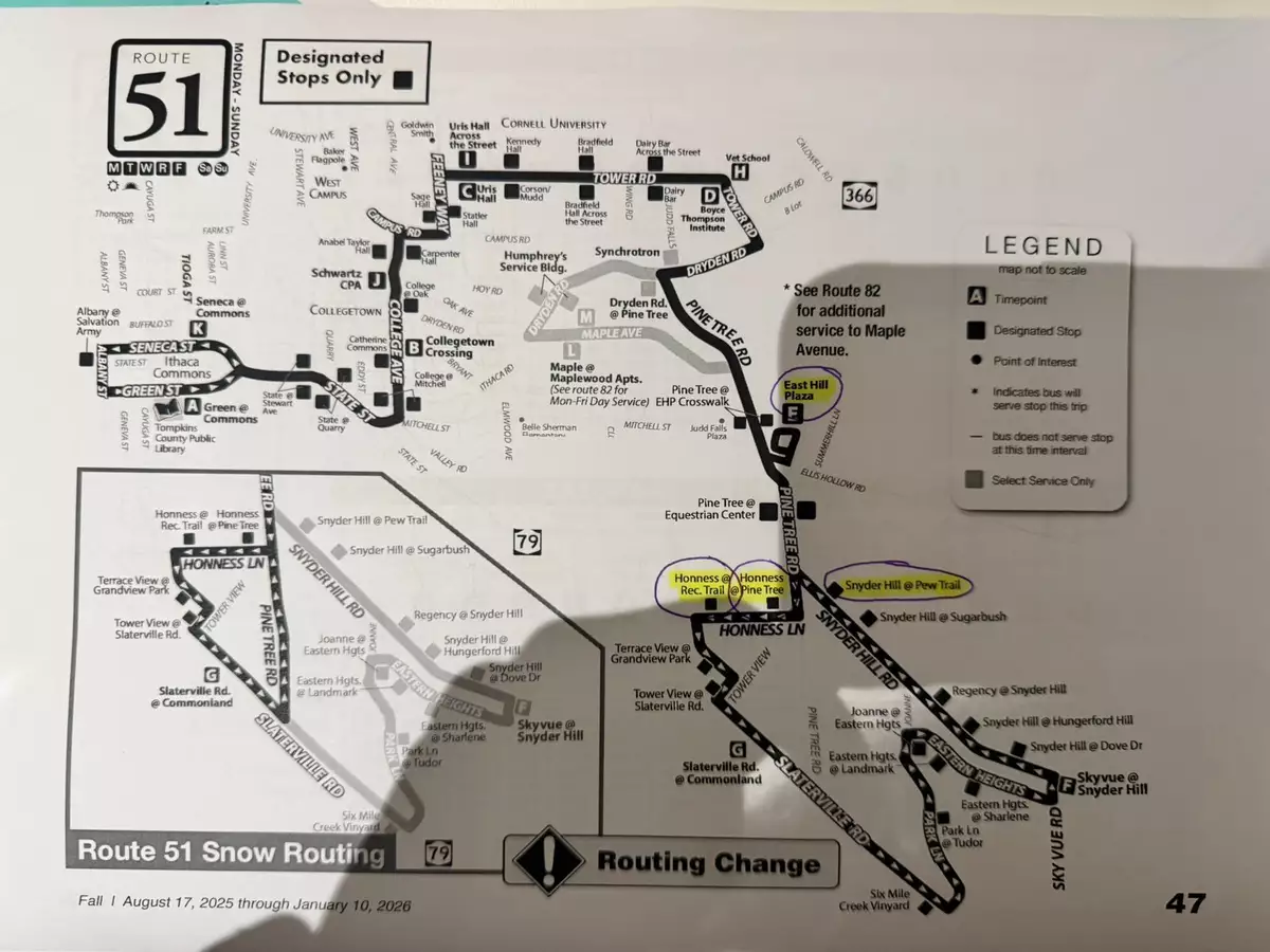 Bus 51 stops right at driveway and goes to Cornell Campus and Downtown Ithaca
